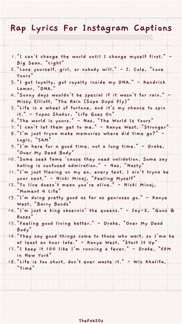 Using rap lyrics for Instagram captions can be a creative and engaging way to express yourself, connect with followers, and add a touch of personality to your posts. By carefully selecting lyrics that align with your message and audience, and by practicing proper attribution, you can leverage the power of rap lyrics to enhance your Instagram presence.